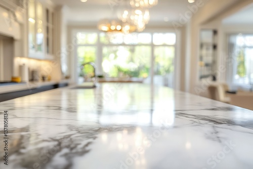 Marble countertop with blurred kitchen background. AI generated illustration.