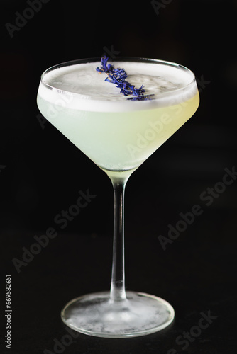 Margarita Cocktail served with eating purple flowers on dark background with copy space