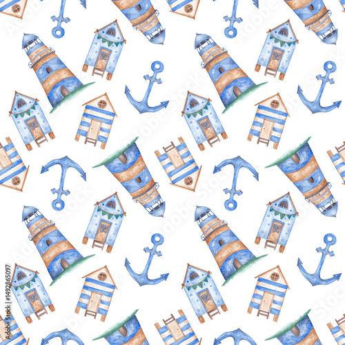 Marine Watercolor Design Elements: Anchor, Lighthouse, Houses