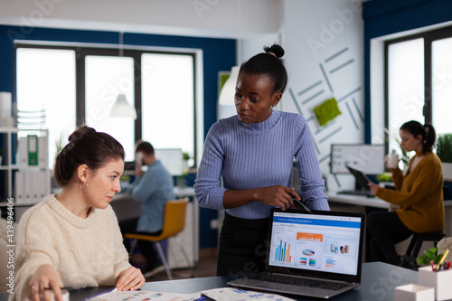 Marketing statistics analysed by diverse team colleagues of start up company. Multiethnic employees gathered in co-working space discussing financial charts.