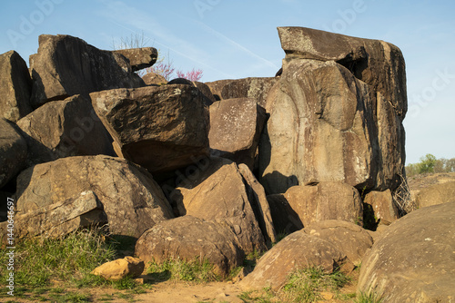 Massive rock formation in a natural landscape, showcasing rugged boulders under a clear sky. Perfect for themes of geology, nature, or outdoor adventure