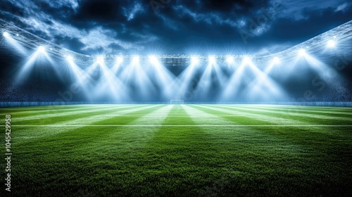 Massive stadium lights lighting up the soccer field, casting long shadows across the pitch under the dark sky.