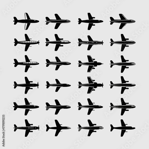 Massive Vector Silhouette Icon Set of Commercial and Passenger Airplanes