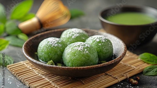 Matcha daifuku with green tea in a Japanese tea setting