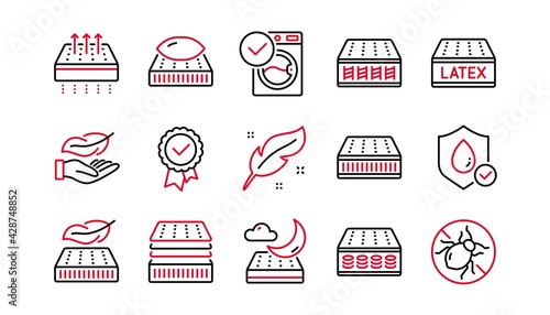 Mattress line icons set. Breathable, Memory foam, latex. Washable pillow, bed tick icons. Light weight, natural material, pocket sprung mattress. Bed mite, antiallergic latex. Linear set. Vector