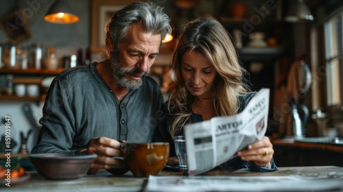 Mature Couple in Pajamas Enjoying Morning Coffee and Reading Newspaper Together at Home