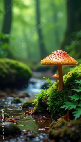 Mature Forrest mushrooms grow near a stream in the forest, ferns, moss, fungi