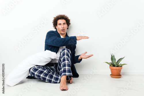 Mature man wearing pajama sitting on house floor shocked and amazed holding a copy space between hands.