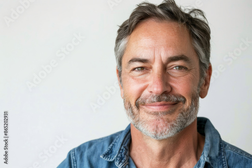 Mature mid aged Caucasian man with a kind smile, gazing into the camera, isolated on white background.