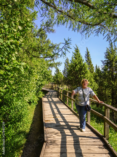 Mature woman tourist resting in a juniper Park by the river