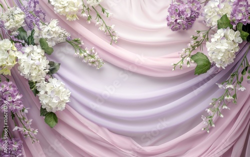 Mauve studio backdrop with a matte finish, mauve silk curtains with soft lavender and white hydrangeas draped over the curtain folds. Copy space