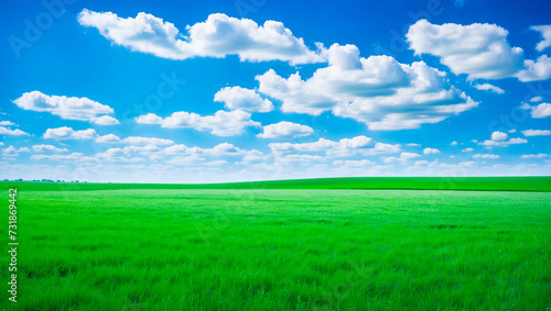 meadow, grassland, landscape,agriculture,lawn, field, sky, cloud, flower, nature, spring,Background image of a vast green field under a bright blue sky. bright green grass Receives light well The ba