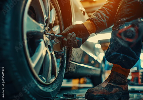 Mechanic Working on Car Tire in a Well-Lit Garage