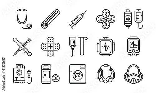 Medical Equipment and Healthcare Icons Set, Outline Vector Icons of Medical Equipment, Healthcare Devices, and Hospital Tools