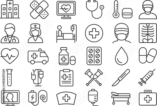 Medical Icon Collection: A comprehensive set of meticulously crafted medical icons, each symbolizing different aspects of healthcare, from hospital symbols to diagnostic tools.