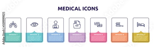 medical icons concept infographic design template. included lungs organ, eye closeup, man with broken arm, medical results folders, electrocardiogram report, brush with tooth paste, illness on bed