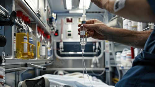 Medical Professional Administering IV Drip in Ambulance Emergency Medical Services