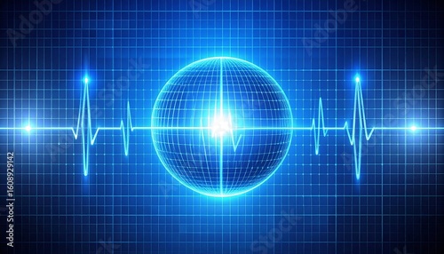 Medical technology graphic with glowing sphere and EKG