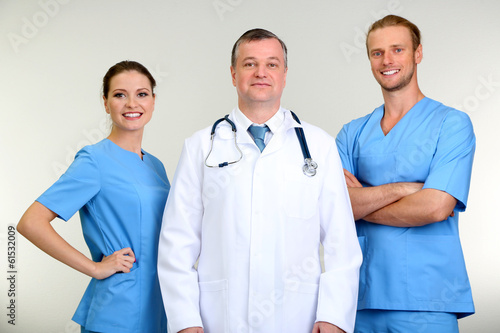 Medical workers on grey background