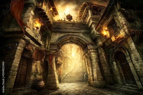 Medieval city gate with shining light