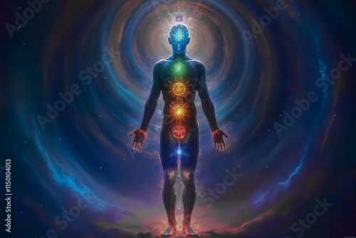 Meditation with chakra light on human body. dynamic spiritual awakening scene, spiritual light body surrounding the meditating. full length body. Galaxy universe background. Colorful chakras and aura.