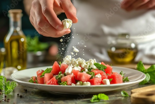 Mediterranean Chef Garnishing a Fresh Watermelon Salad with Feta Cheese in a Rustic Kitchen Setting