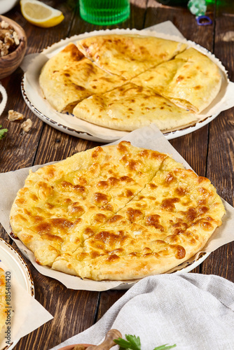 Megrelian and Imeretian Khachapuri on Wooden Background - Authentic Georgian Menu
