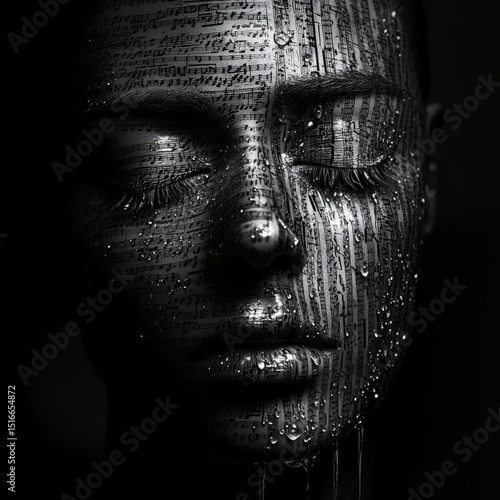 Melody's Visage: A serene face, embodies a symphony of emotions, lines of sheet music adorns the skin as tears cascade down, a metaphor for the emotional depths of music and its touch on the soul.