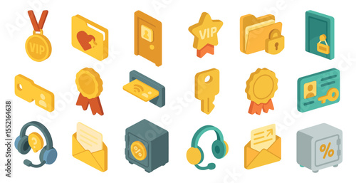 Membership vip isometric icons set – key, secure, access badge symbols