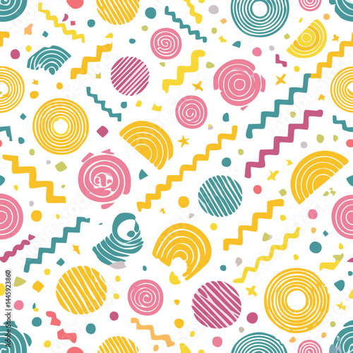 Memphis geometric seamless pattern. Multicolor abstract background in retro 80s, 90s style with various shapes: circles, dots, zigzags, spirals, wavy lines.shape, colourful, graphic, minimal, party, f
