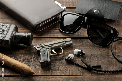 Men's Accessories. men's style. Cigar, perfume, wallet, glasses, business card holder, headphones on a brown wooden background.