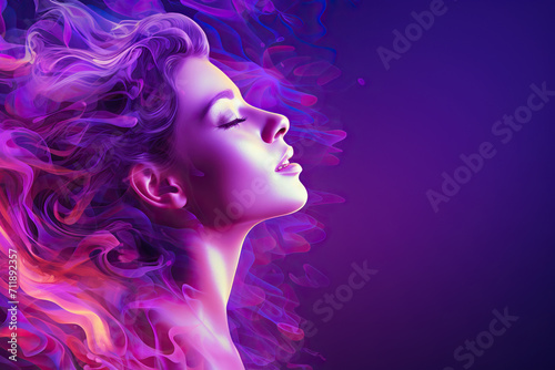 Mental health concept. Beautiful woman face with purple smoke on her head. Generated by artificial intelligence