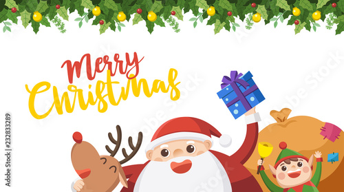 Merry Christmas And Happy New Year Greeting Card. Santa with elf and reindeer.