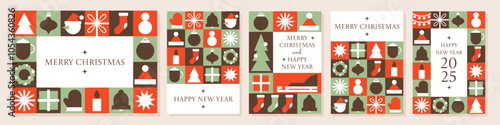 Merry Christmas and Happy New Year greeting card set. Vector vertical and horizontal a4 poster. Minimalist geometric modern Xmas design. Snowflakes, Christmas tree, gift, sleigh. For invitation, cover