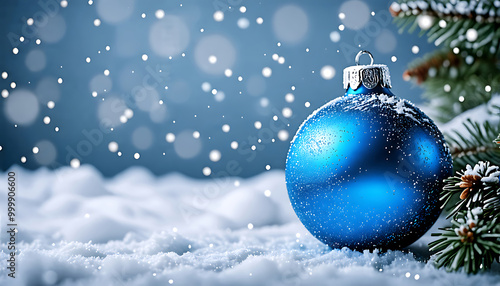 Merry Christmas background decoration. Xmas Banner with Text Space. Happy New Year background. Blue Christmas tree bauble. Happy Holidays greeting card. Winter Xmas Holiday Theme.