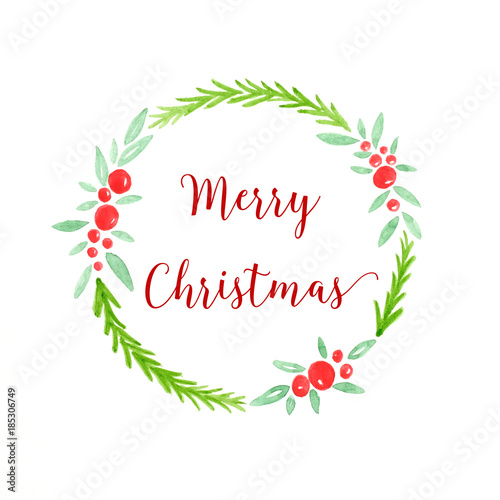 Merry Christmas wreath watercolor drawing on white paper background, Christmas greeting card background