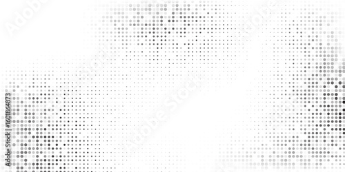 Mesh grunge halftone gradient background. Faded grit noise texture. White and black design abstract vector illustration