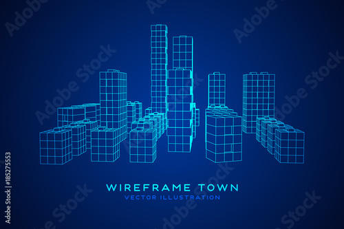 Mesh low poly wireframe cubes array like skyscraper city. Connected lines town. Connection Box Structure. Digital Data Visualization Concept. Vector Illustration.