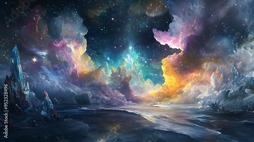 Mesmerizing Cosmic Landscape with Glowing Ethereal Castle in Serene Nighttime Dreamscape
