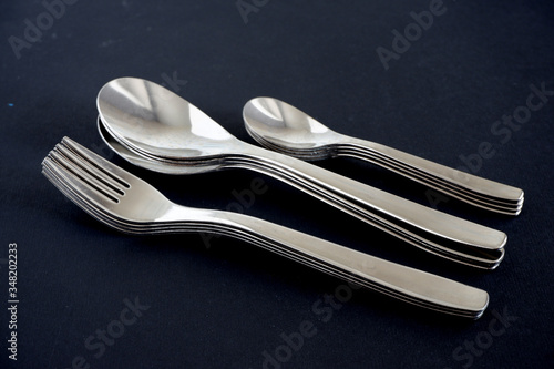 Metal spoons and forks on a black background