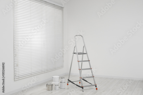 Metallic folding ladder and painting tools indoors