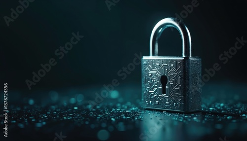 Metallic padlock on dark background. Cybersecurity data protection in digital age. Futuristic design elements reflective surface, circuit board pattern. Represents security technology concept.