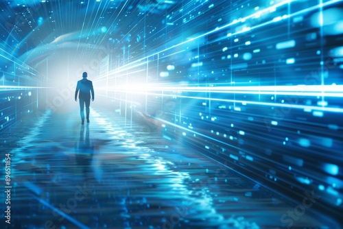 Metaphorical image of executive shadow on vibrant blue lines backdrop Success metaverse and direction idea