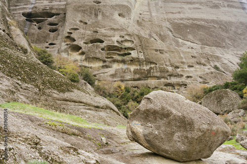 Meteora, Greece - Dec 19, 2019: Abandoned monastic cave houses known as "cells" in Meteora (meaning "suspended into air") in Trikala, Greece near a hiking path .