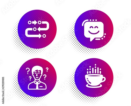 Methodology, Smile face and Support consultant icons simple set. Halftone dots button. Coffee cup sign. Development process, Chat, Question mark. Hot drink. Business set. Vector