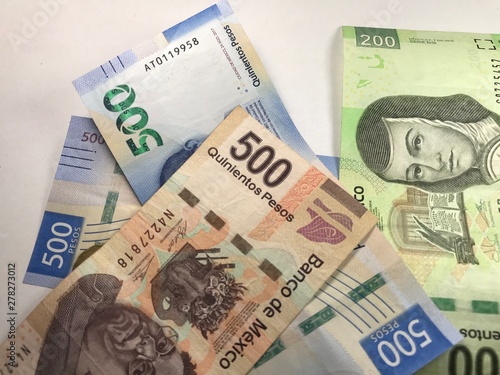 Mexican peso bills spread over white background