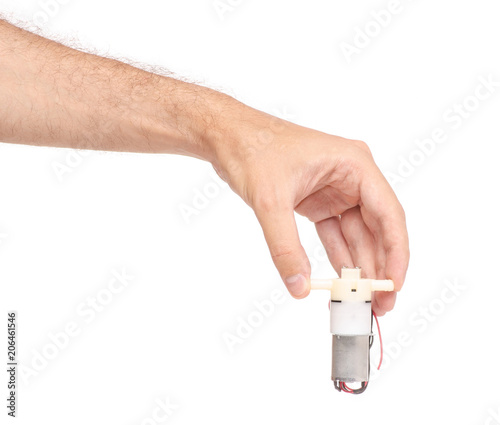 micro motor pump in hand on white background isolation
