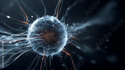 Microscopic view of biological cell with glowing neural connections and electric energy impulses