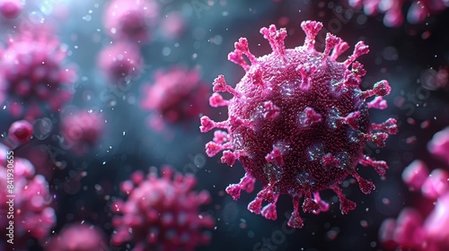 Microscopic view of the virus, highlighting detailed pink structures against a dark background, representing the health crisis.