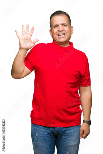 Middle age arab man over isolated background showing and pointing up with fingers number five while smiling confident and happy.